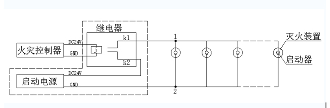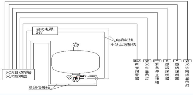2. 将灭火装置上的电启动器与火灾(zāi)报警控制系统相联,灭火装置可以电控启动。