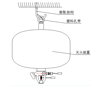 3、将带钩的膨胀螺钉(dìng)固定在保护区上方的混凝预制板顶部(bù)上,再将灭火装置上部的吊环钩在(zài)膨胀螺钉弯钩处,用塑料扎带捆死。见图5