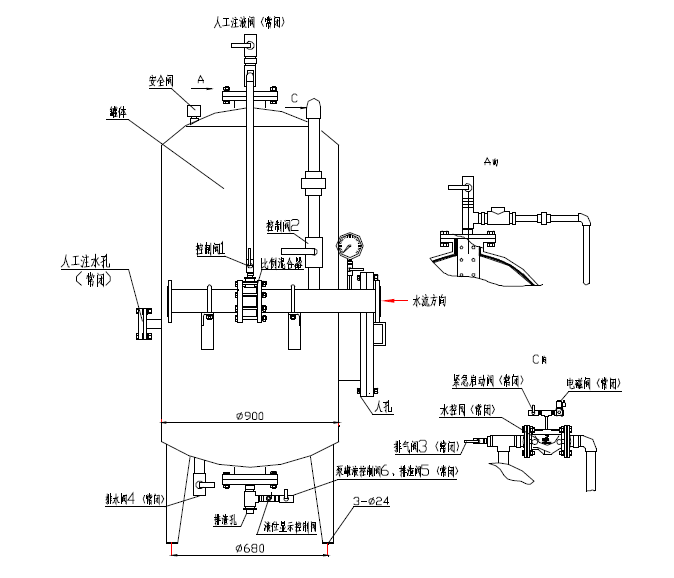 a: 填液(yè)前将(jiāng)注液孔处的DN40球阀打开,并保证(zhèng)排气阀3处于打开状态,排(pái)渣阀5、排水阀4、控制阀1 处于关闭状态,只(zhī)有(yǒu)这(zhè)样才能将泡沫原液顺