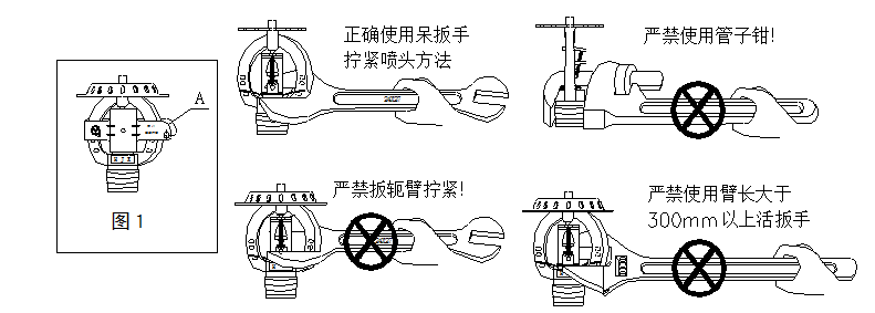 3、噴頭安裝時必須使用(22X24)的呆扳手的相應扳口,並注意正確使用,如下圖。噴頭擰緊(jǐn)力(lì)距為10-20N.m,嚴禁超過(guò)30N.m。