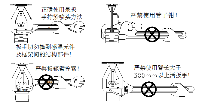 3、噴頭安裝時應使用(30X32)的呆扳(bān)手的相應(yīng)扳口(kǒu),並注意正確使用,如(rú)下圖(tú)。噴頭擰緊力(lì)距為10-20N.m,嚴禁超過(guò)30N.m。