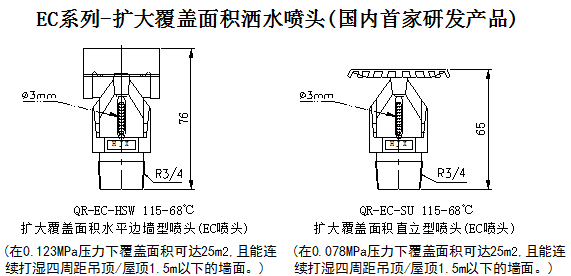 EC係列(liè)噴頭采用特殊設計的框架和K=115的較大流量和快速響應玻璃球,響應時間快,具有比常規灑水噴頭更大的保護範圍,適用於輕、中危險級(jí)場所,如商場、旅館、飯店、辦公樓、醫院、博物館、工業廠房(fáng)等場所。