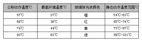 4、常用的玻(bō)璃球噴頭公稱動作溫度及(jí)顏色標誌: