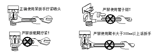 3、噴頭安裝時應(yīng)使用(22X24)的呆扳手的相應扳(bān)口,並注意正確使用(yòng),如下圖。噴頭擰緊力距
